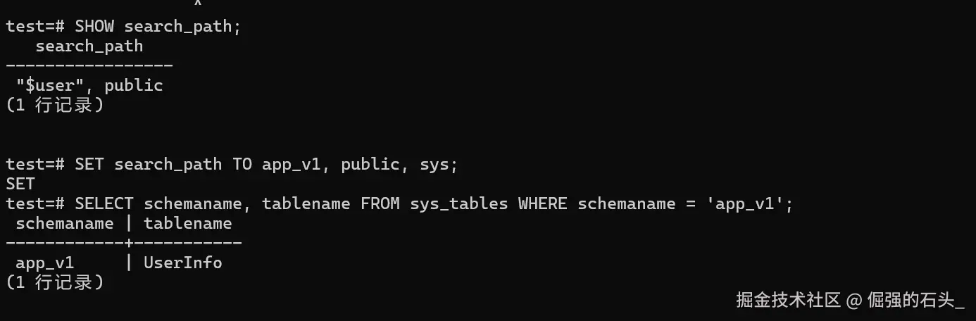 search_path:sqlSHOW search_path; -- 如果你的表在 app_v1 模式下,需要设置: SET search_path TO app_v1, public, sys; -