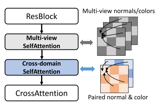 如果两者不一致,重建的3D模型就会很奇怪。跨域注意力机制确保同一视角的法线图和彩色图在几何上完全对应。