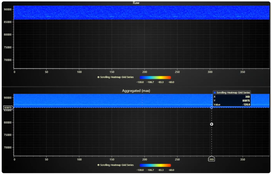 在本次 v8.1 版本中,热力图系列新增内置聚合功能,适用于极高密度的数据图表场景 ------ 当多个数据点可能映射到屏幕上的同一个像素时,通过启用最值(min-max)聚合,可以确保用户在任意缩放状态下都能看到峰值。