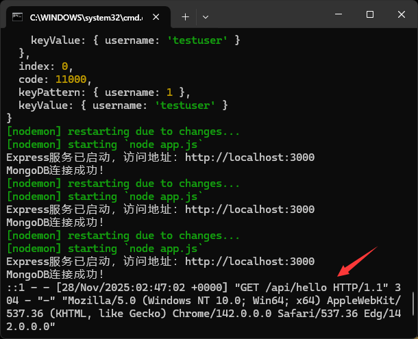 app.use():注册中间件(日志、跨域、解析 JSON);app.get('/api/hello'):定义 GET 路由;app.listen(3000):启动服务并监听端口。