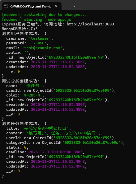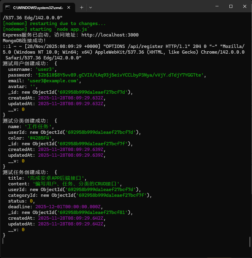 javascript// 1. 引入Express框架(安装后才能require) const express = require('express'); // 2. 创建Express应用实例(核心对象,管理路由/中间件) const app = express(); // 引入Mongoose const mongoose = require('mongoose'); // 连接MongoDB(本地数据库,数据库名:android_app_db) // 原理:mongoose.connect()建立与MongoDB的连接,返回Promise mongoose.connect('mongodb://localhost:27017/android_app_db') .then(() => console.log('MongoDB连接成功!')) .catch(err => console.error('MongoDB连接失败:', err)); // 引入模型(放在MongoDB连接代码之后) const User = require('./models/User'); const Category = require('./models/Category'); const Task = require('./models/Task'); /* // 测试创建一个用户(仅测试,后续可删除) // 原理:通过Model.create()插入数据 User.create({ username: 'testuser', password: '123456', email: 'test@example.com' }).then(user => { console.log('测试用户创建成功:', user); // 基于该用户创建分类 return Category.create({ name: '工作任务', userId: user._id, color: '#4285F4' }); }).then(category => { console.log('测试分类创建成功:', category); // 基于用户和分类创建任务 return Task.create({ title: '完成安卓APP后端接口', content: '编写用户、任务、分类的CRUD接口', userId: category.userId, categoryId: category._id, deadline: new Date('2025-12-01') }); }).then(task => { console.log('测试任务创建成功:', task); }).catch(err => { console.error('数据创建失败:', err); }); */ // 3. 定义端口号(后端服务监听的端口,安卓APP后续会访问这个端口) const PORT = 3000; // 引入morgan const morgan = require('morgan'); // 配置日志格式:combined(标准格式,包含请求头、IP、响应时间等) // 原理:app.use(morgan('combined')) 表示所有请求都经过日志中间件 app.use(morgan('combined')); // 引入cors const cors = require('cors'); // 全局配置跨域(允许所有域名访问,开发环境可用;生产环境需指定具体域名) app.use(cors({ origin: '*', // 允许所有域名(生产环境改为安卓APP的域名/IP) methods: ['GET', 'POST', 'PUT', 'DELETE'], // 允许的请求方法 allowedHeaders: ['Content-Type', 'Authorization'] // 允许的请求头 })); // 引入认证中间件 const { auth } = require('./middleware/authMiddleware'); const { encryptPassword,comparePassword, generateToken,verifyToken } = require('./utils/authUtils'); //const User = require('./models/User'); //const bcrypt = require('bcryptjs'); // 4. 配置内置中间件:解析JSON格式的请求体(安卓APP传参通常用JSON) // 原理:客户端(安卓)POST请求的JSON数据,需通过此中间件解析后才能在路由中获取 app.use(express.json()); // 5. 定义测试路由(安卓APP的接口本质就是路由) // 格式:app.请求方法(路由路径, 处理函数) // GET请求:客户端获取数据(如安卓APP获取用户列表) app.get('/api/hello', (req, res) => { // req:请求对象(包含客户端传递的参数、请求头等) // res:响应对象(用于向客户端返回数据) res.status(200).json({ code: 200, message: 'Express服务启动成功!==》该了一下,会重启吗?', data: null }); }); // 1. 注册接口:加密明文密码后存储 app.post('/api/register', async (req, res) => { try { const { username, password ,email} = req.body; // 校验参数 if (!username || !password) { return res.status(400).json({ message: '用户名/密码不能为空' }); } /* // 检查用户是否已存在 const existUser = User.find(u => u.username === username); if (existUser) { return res.status(400).json({ message: '用户已存在' }); } */ // 核心:加密明文密码 const hashedPassword = await encryptPassword(password); User.create({ username: username, password: hashedPassword, email: email }).then(user => { console.log('测试用户创建成功:', user); // 基于该用户创建分类 return Category.create({ name: '工作任务', userId: user._id, color: '#4285F4' }); }).then(category => { console.log('测试分类创建成功:', category); // 基于用户和分类创建任务 return Task.create({ title: '完成安卓APP后端接口', content: '编写用户、任务、分类的CRUD接口', userId: category.userId, categoryId: category._id, deadline: new Date('2025-12-01') }); }).then(task => { console.log('测试任务创建成功:', task); }).catch(err => { console.error('数据创建失败:', err); }); } catch (err) { res.status(500).json({ message: `注册失败:${err.stack}` }); } }); // 示例1:登录接口(无需认证,生成令牌) app.post('/api/login', async (req, res) => { try { const { username, password } = req.body; console.log(`input=> username:${username};password:${password}`); // 1. 查询用户 const user = await User.findOne({ username }); console.log(`user:${user};user.password:${user.password}`); if (!user) { return res.status(400).json({ code: 400, message: '用户不存在', data: null }); } // 2. 验证密码 const isMatch = await comparePassword(password, user.password); if (!isMatch) { return res.status(400).json({ code: 400, message: '密码错误', data: null }); } // 3. 生成令牌 const token = generateToken(user._id); res.status(200).json({ code: 200, message: '登录成功', data: { token, username: user.username } }); } catch (err) { res.status(500).json({ code: 500, message: '服务器错误:' + err.stack, data: null }); } }); // 示例2:需要认证的接口(获取用户的任务列表) // 原理:auth中间件先验证令牌,通过后才执行路由逻辑 app.get('/api/tasks', auth, async (req, res) => { try { // req.userId由auth中间件存入,查询该用户的所有任务 const tasks = await Task.find({ userId: req.userId }); res.status(200).json({ code: 200, message: '获取任务列表成功', data: tasks }); } catch (err) { res.status(500).json({ code: 500, message: '服务器错误', data: null }); } }); // 6. 启动服务,监听指定端口 app.listen(PORT, () => { console.log(`Express服