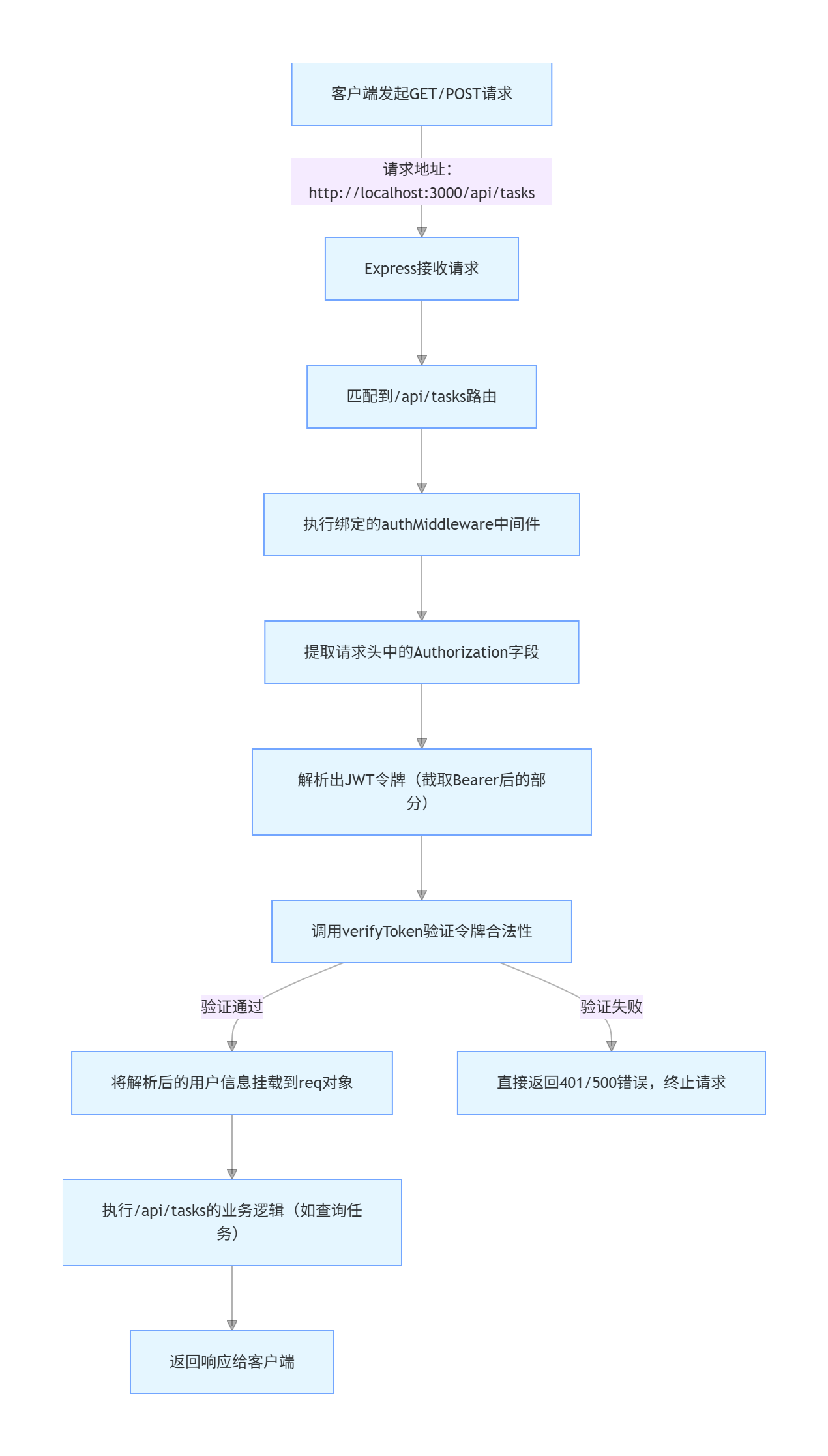 app.js中引入并使用认证中间件:javascript// 引入认证中间件 const { auth } = require('./middleware/authMiddleware'); const { encryptPassword, generateToken } = require('./utils/authUtils'); const User = require('./models/User'); // 示例1:登录接口(无需认证,生成令牌) app.post('/api/login', async (req, res) => { try { const { username, password } = req.body; // 1. 查询用户 const user = await User.findOne({ username }); if (!user) { return res.status(400).json({ code: 400, message: '用户不存在', data: null }); } // 2. 验证密码==》此处逻辑有错误❌=》后面有更正代码 const isMatch = await bcrypt.compare(password, user.password); if (!isMatch) { return res.status(400).json({ code: 400, message: '密码错误', data: null }); } // 3. 生成令牌 const token = generateToken(user._id); res.status(200).json({ code: 200, message: '登录成功', data: { token, username: user.username } }); } catch (err) { res.status(500).json({ code: 500, message: '服务器错误', data: null }); } }); // 示例2:需要认证的接口(获取用户的任务列表) // 原理:auth中间件先验证令牌,通过后才执行路由逻辑 app.get('/api/tasks', auth, async (req, res) => { try { // req.userId由auth中间件存入,查询该用户的所有任务 const tasks = await Task.find({ userId: req.userId }); res.status(200).json({ code: 200, message: '获取任务列表成功', data: tasks }); } catch (err) { res.status(500).json({ code: 500, message: '服务器错误', data: null }); } });📌代码解释: