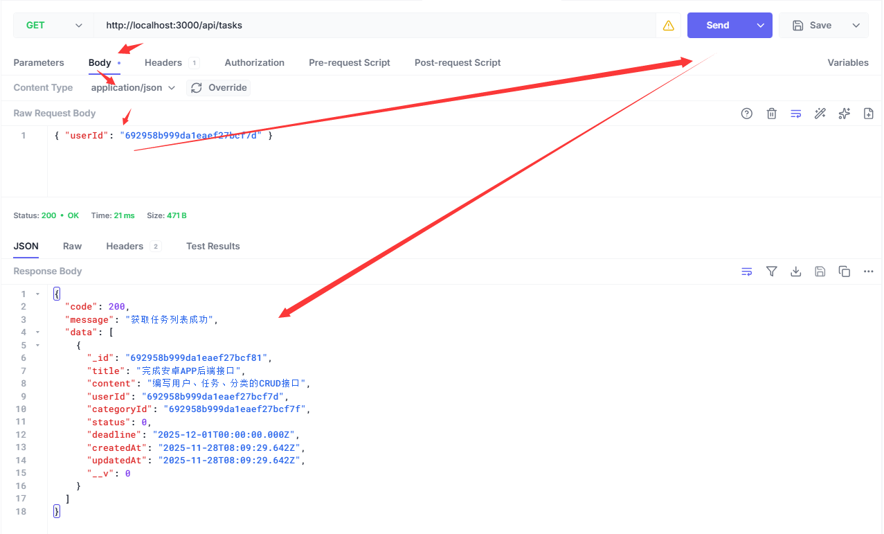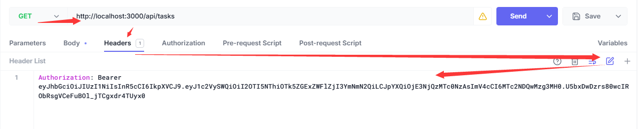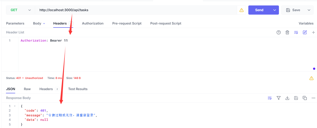 http://localhost:3000/api/tasks,请求头添加:Authorization: Bearer <返回的token>执行界面参考: