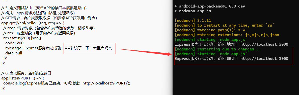 app.get('/api/hello', (req, res) => { ... })是给 Express 应用注册一个「GET 请求路由」 ,作用是:当客户端(如安卓 APP)向后端发送GET方式的http://localhost:3000/api/hello请求时,Express 会触发后面的回调函数,处理该请求并返回响应。