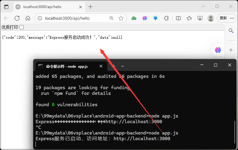 app.js,每一行都有注释解释原理 :// 1. 引入Express框架(安装后才能require) const express = require('express'); // 2. 创建Express应用实例(核心对象,管理路由/中间件) const app = express(); // 3. 定义端口号(后端服务监听的端口,安卓APP后续会访问这个端口) const PORT = 3000; // 4. 配置内置中间件:解析JSON格式的请求体(安卓APP传参通常用JSON) // 原理:客户端(安卓)POST请求的JSON数据,需通过此中间件解析后才能在路由中获取 app.use(express.json()); // 5. 定义测试路由(安卓APP的接口本质就是路由) // 格式:app.请求方法(路由路径, 处理函数) // GET请求:客户端获取数据(如安卓APP获取用户列表) app.get('/api/hello', (req, res) => { // req:请求对象(包含客户端传递的参数、请求头等) // res:响应对象(用于向客户端返回数据) res.status(200).json({ code: 200, message: 'Express服务启动成功!', data: null }); }); // 6. 启动服务,监听指定端口 app.listen(PORT, () => { console.log(`Express服务已启动,访问地址:http://localhost:${PORT}`); });