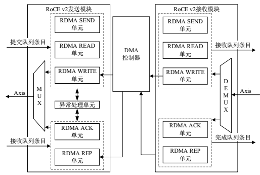 图1 RoCE v2 发送及接收模块结构及数据转移图
