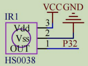 红外接收头的输出管脚接至 P3.2 管脚,为了保证红外接收头输出管脚默认为高电平,