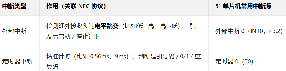让单片机能检测NEC协议的时序(9ms引导码、0/1的时长等),为解码做准备*/