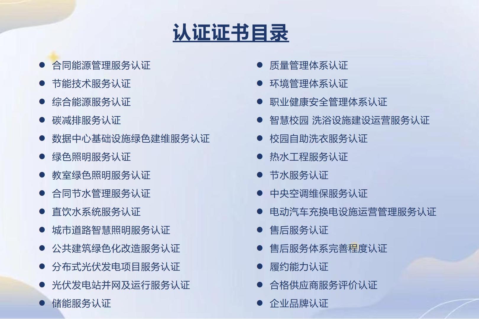 昆山市某能源费用托管项目采信以下资质与证书:综合能源服务认证、合同能源管理服务认证、节能技术服务认证、合同节水技术认证证书及高级能源管理证书。