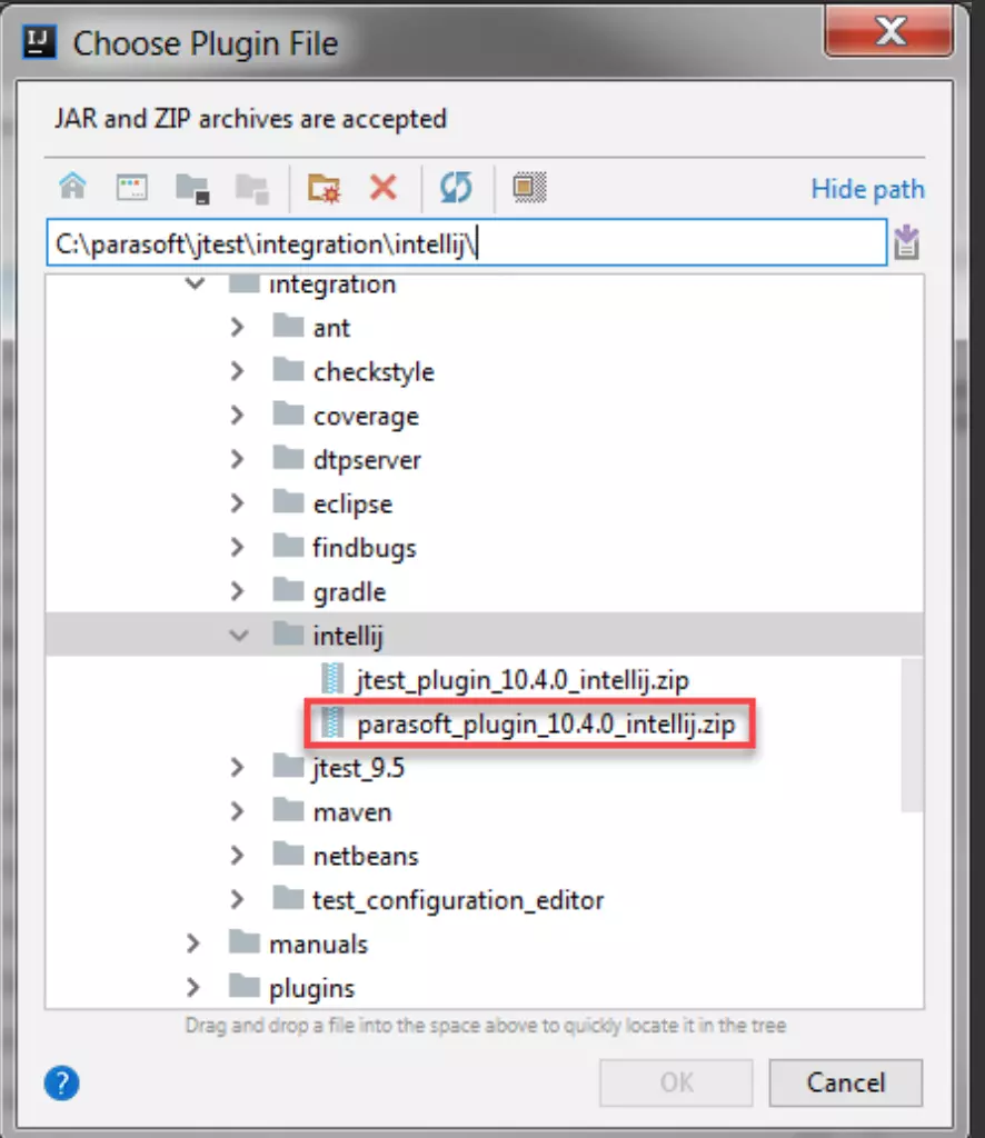 点击齿轮图标菜单,选择 从磁盘安装插件...,然后选择\\integration\\intellij\\parasoftplugin_intellij.zip,并点击确定。