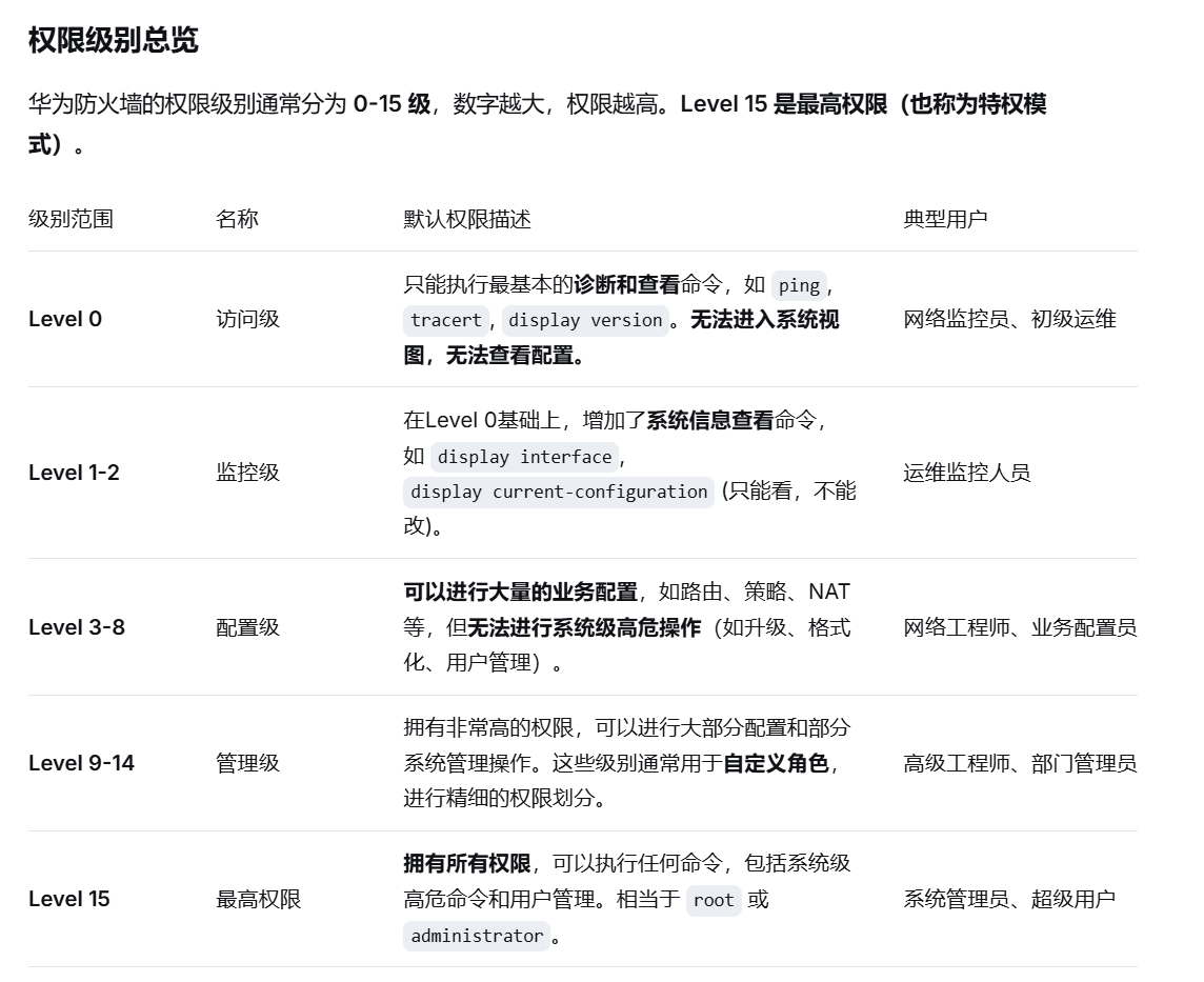 华为防火墙(以及几乎所有企业级设备)的安全访问模型是 "分层解耦" 设计的。