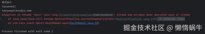 只能消费一次:一个流一旦被终端操作消费过,就不能再被使用。如果需要再次处理,必须从数据源重新创建一个新的流。