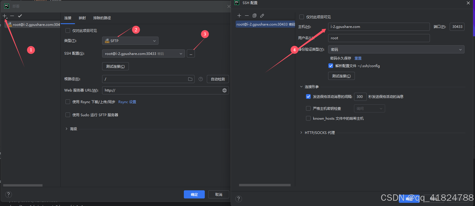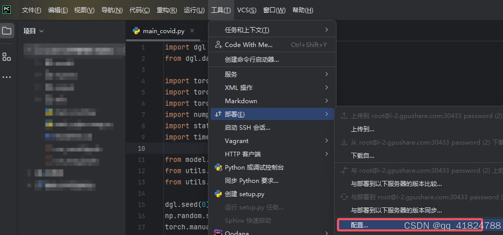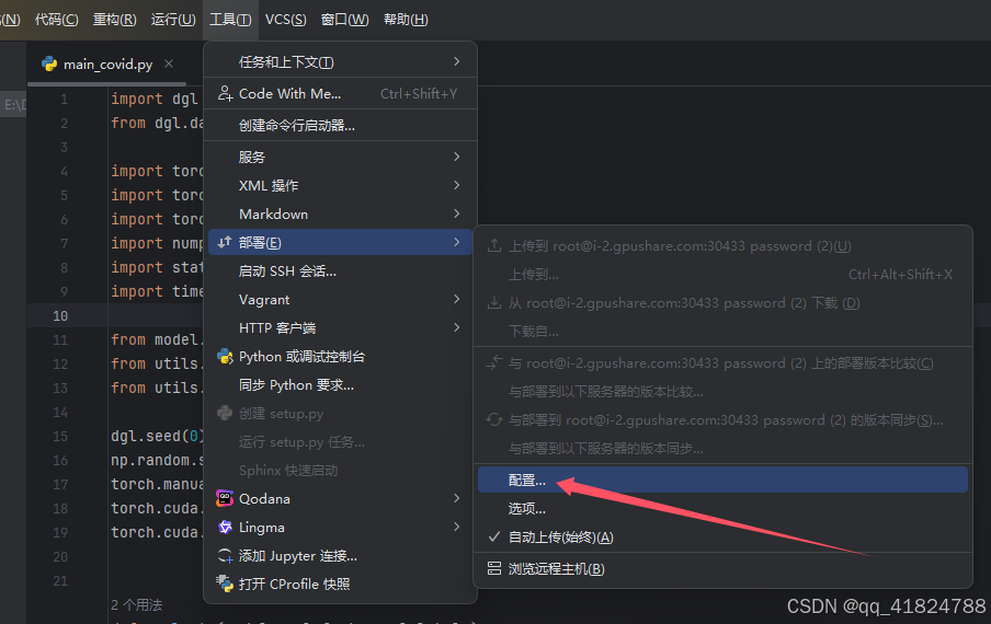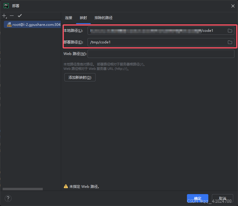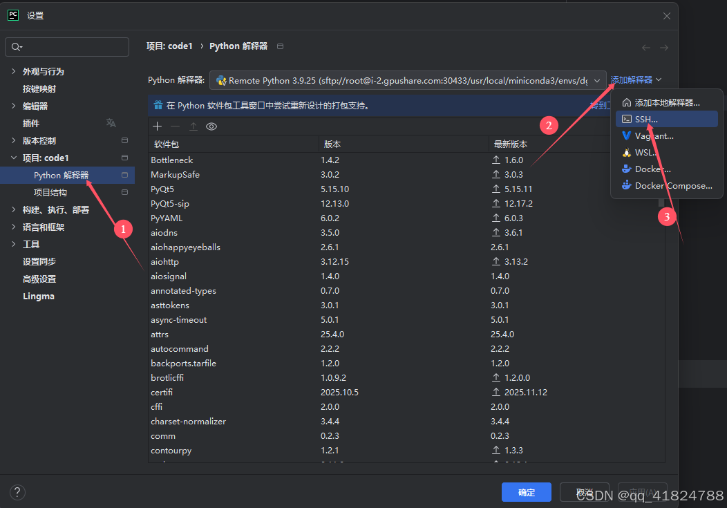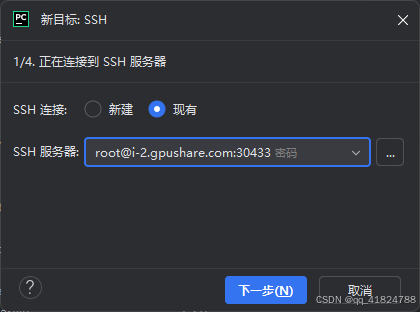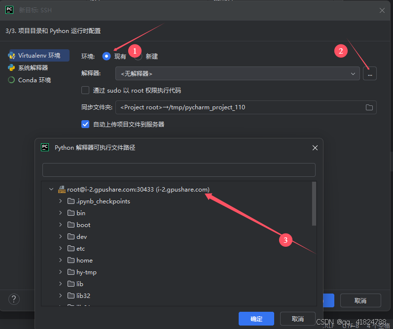 在第③步里找到自己conda环境中的python解释器,我的在/usr/local/miniconda3/envs/dg_1/bin/python,可以勾选"自动上传项目文件到服务器",但是数据集太大,上传较慢,可以通过OSS命令上传到服务器,本地的数据集可以换个文件夹放置。!!!!