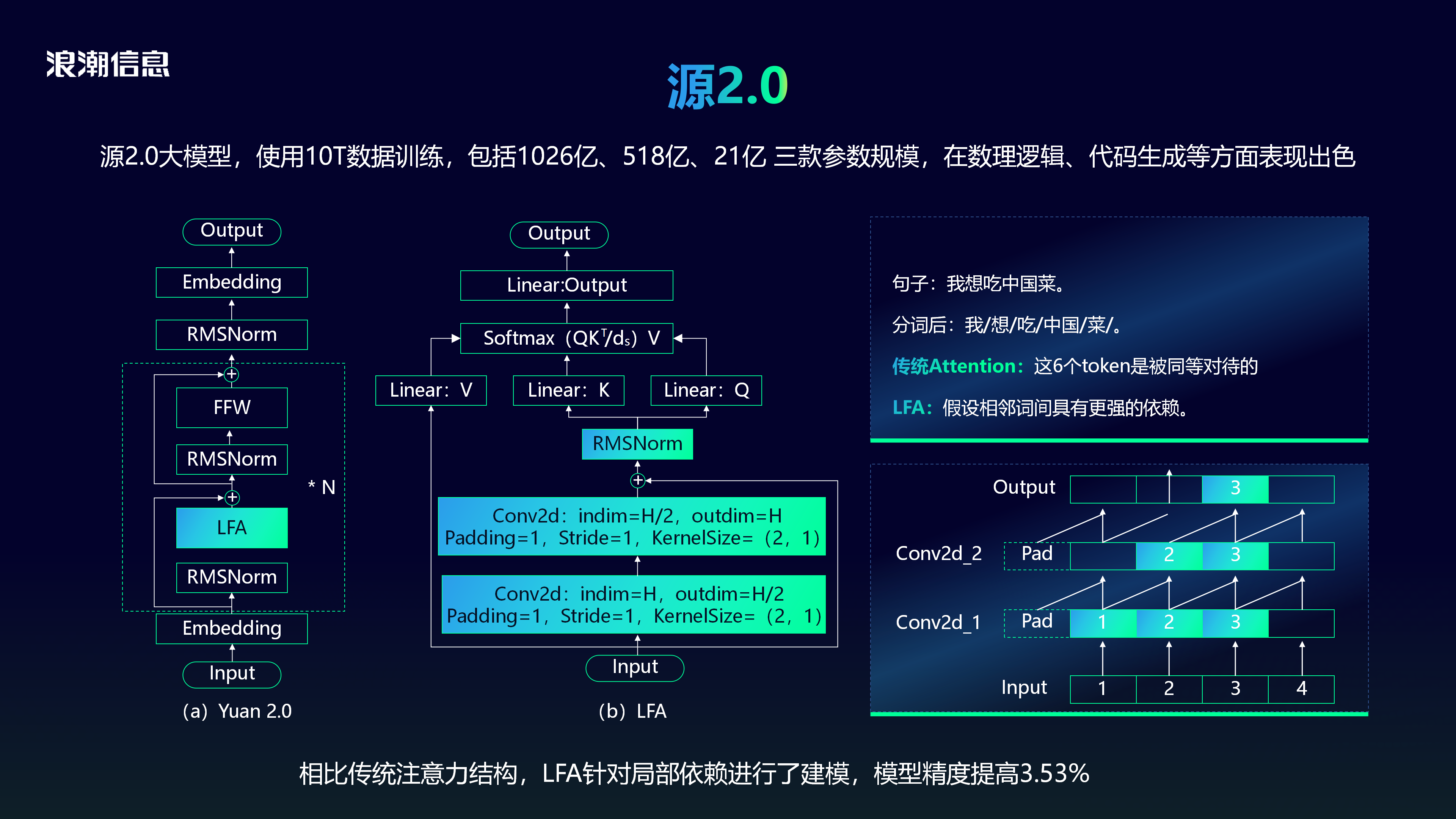 在算法方面,与传统Attention对输入的所有文字一视同仁不同,源2.0提出了局部注意力过滤增强机制(Localized Filtering-based Attention, LFA),它假设自然语言相邻词之间有更强的语义关联,因此针对局部依赖进行了建模,最后使得模型精度提高3.53%。
