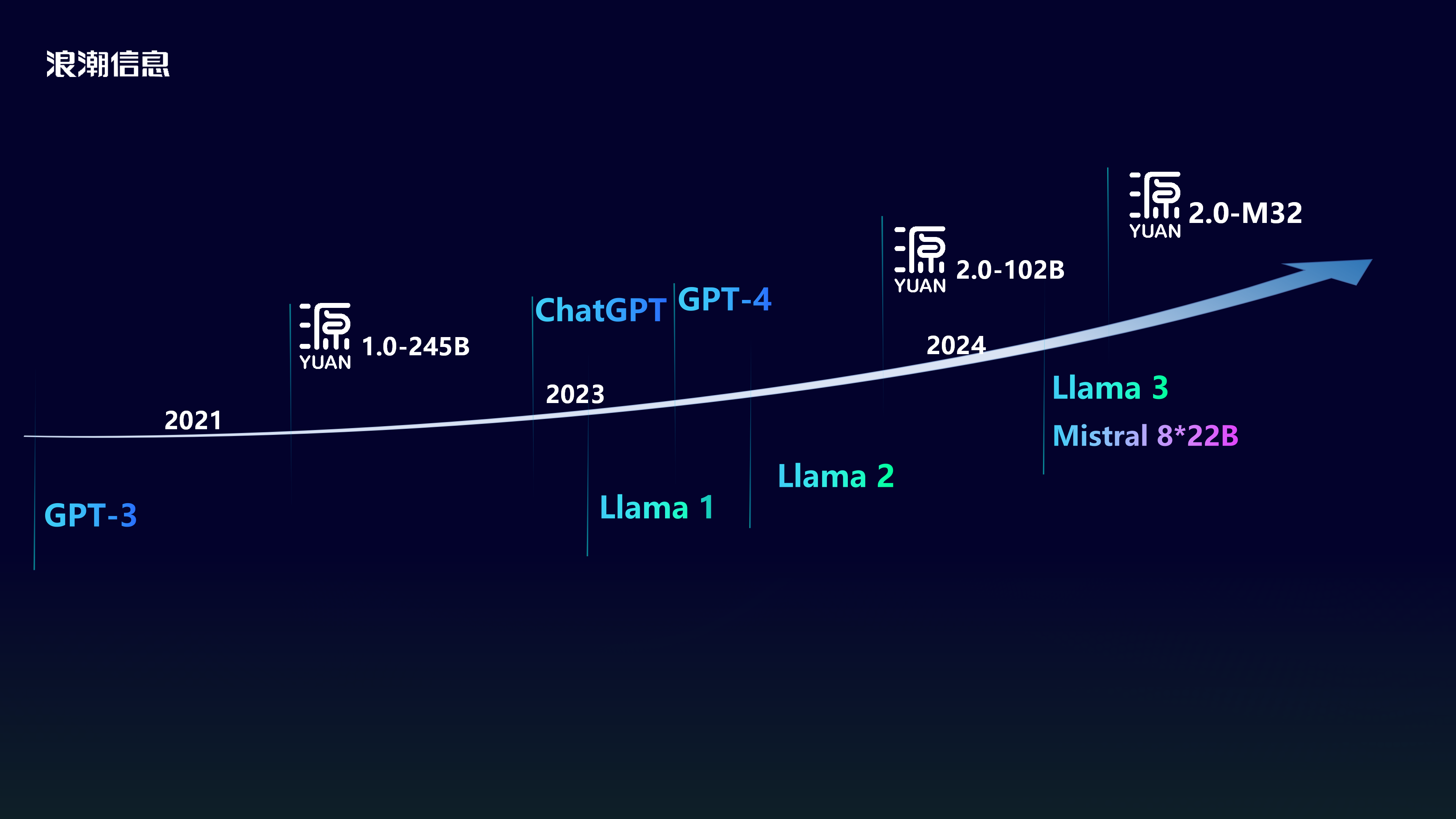 2024年5月,源2.0-M32发布,它是一个混合专家(Mixture of Experts, MoE)大模型,使用2000B Tokens训练,包含400亿参数,37亿激活参数