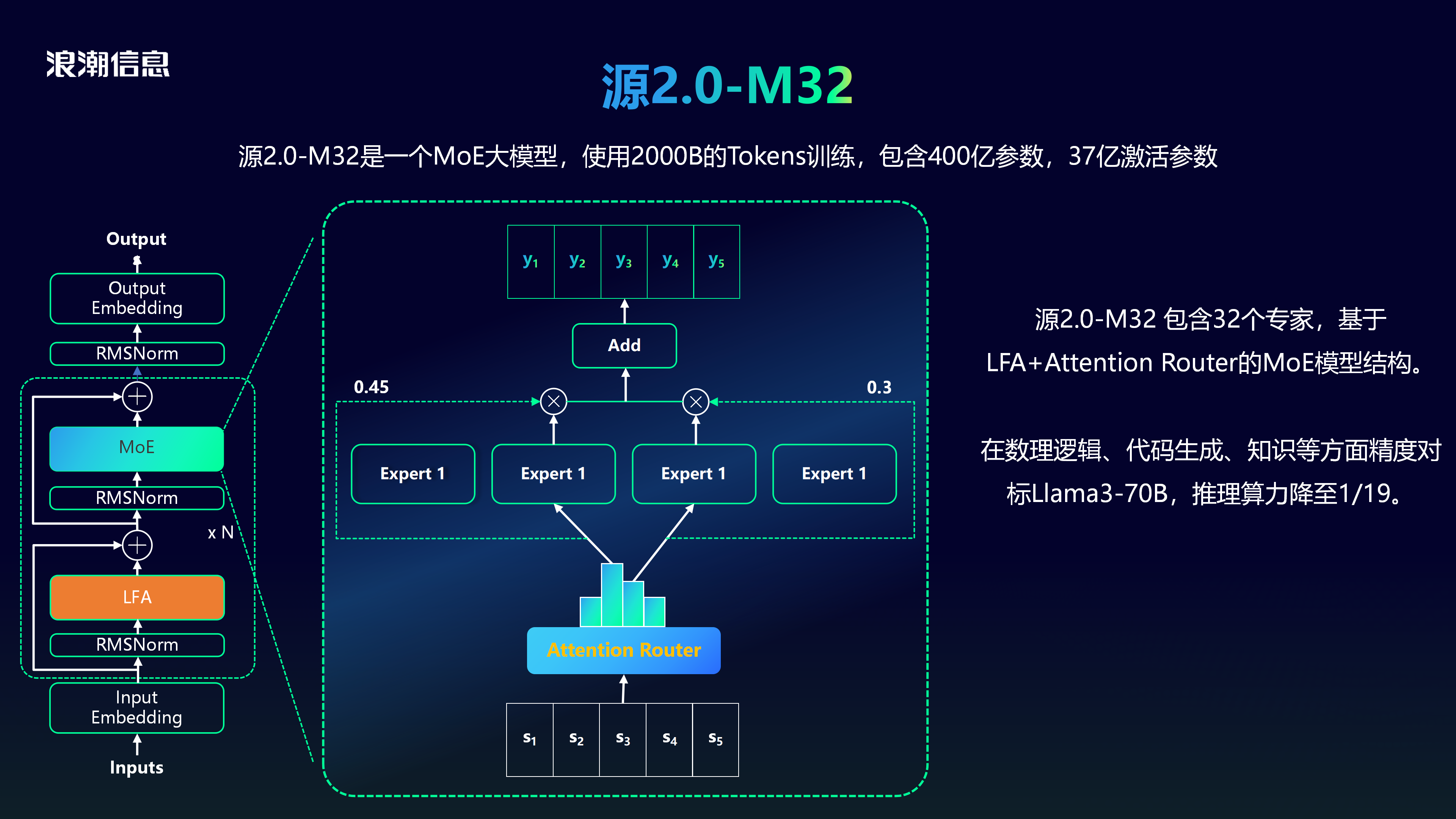 源2.0-M32 包含32个专家,基于LFA+Attention Router的MoE模型结构。