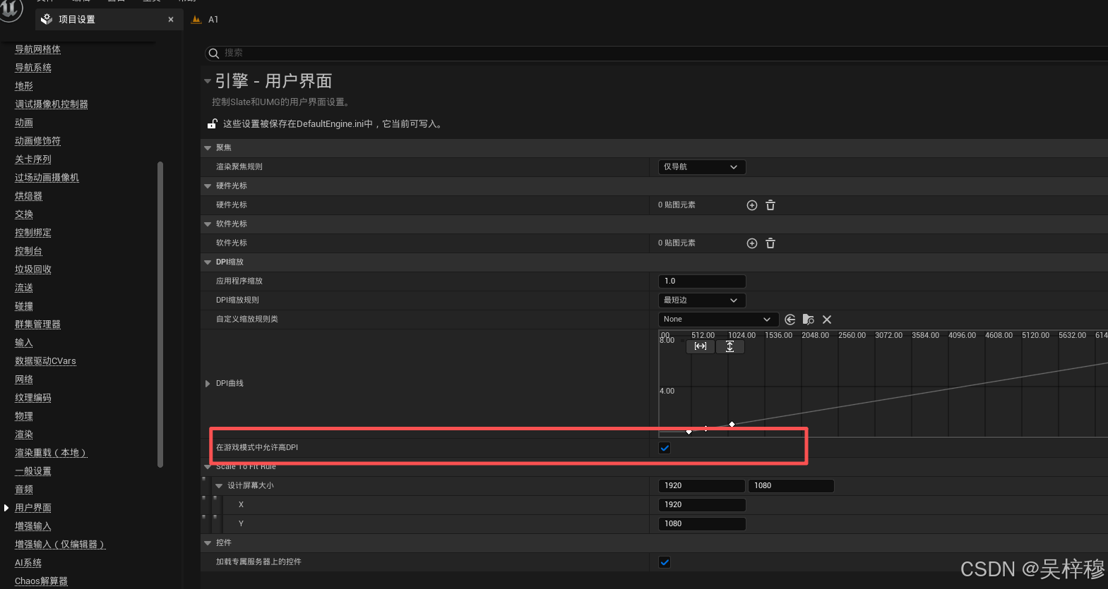 2 UE 项目设置/引擎/用户界面,勾选在游戏模式中允许高DPI(可以直接搜索DPI)