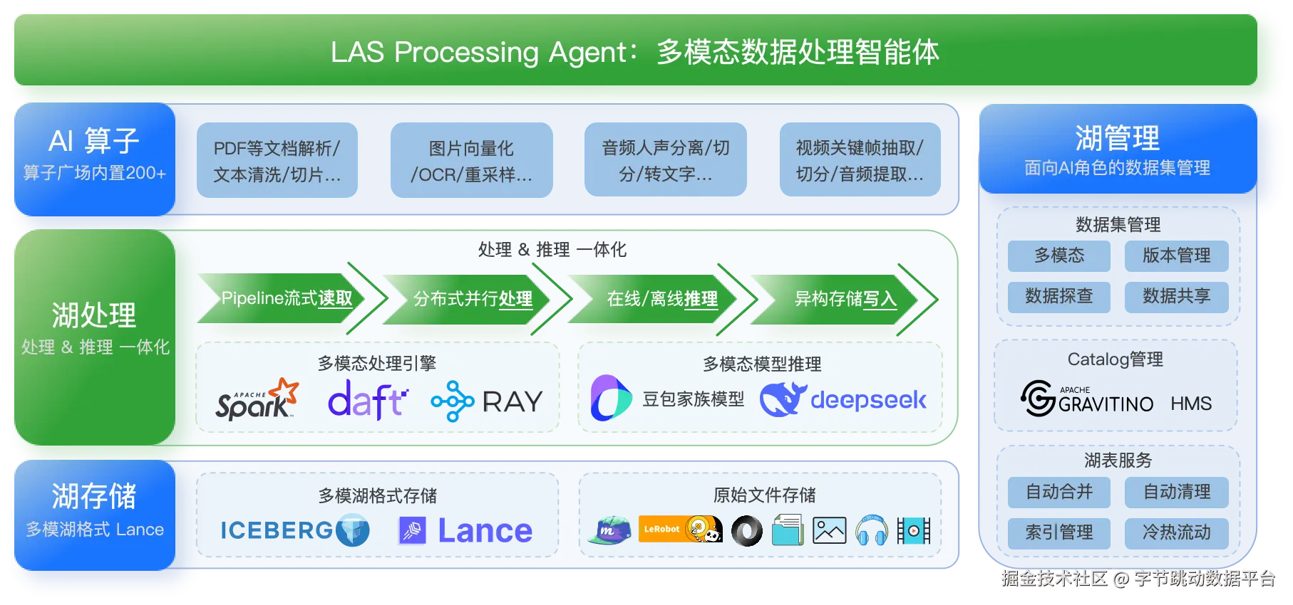LAS AI 数据湖产品是火山引擎为企业适应AI Agent时代推出的新一代多模态场景解决方案,孵化于字节跳动大模型训练场景,面向多模态数据场景,提供湖存储、湖管理、湖计算三大能力、通过"湖存储Lance+湖计算Daft"为核心要素,针对性解决视频、图片等非结构化数据处理的痛点。
