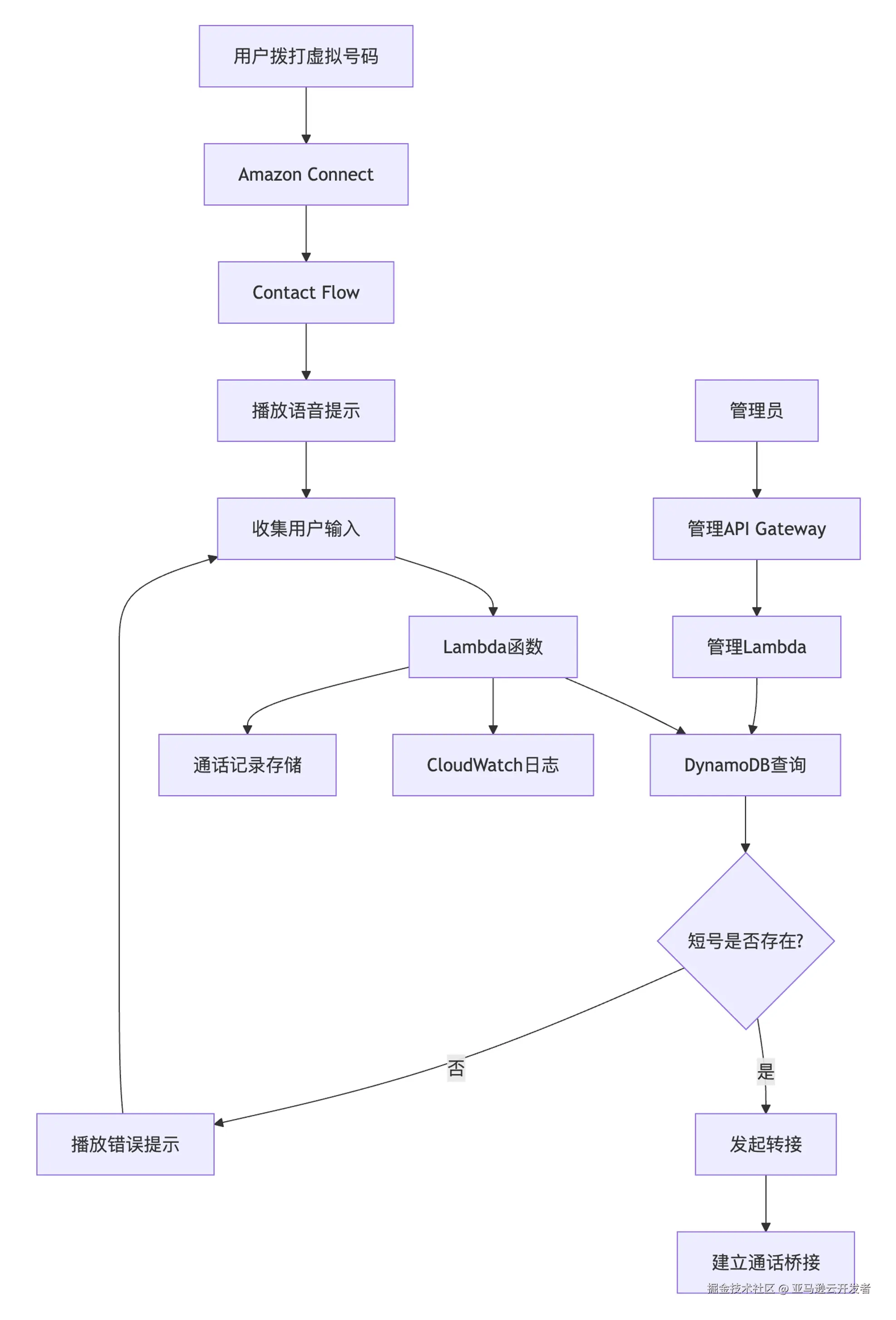 系统的核心工作流程:用户拨打虚拟号码 → Connect接听并播放提示音 → 收集用户输入的短号 → Lambda查询映射关系 → 发起转接到真实号码 → 建立通话桥接。