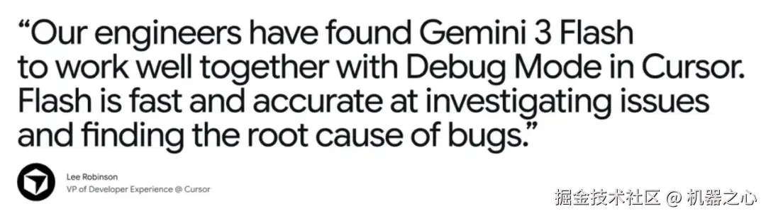 Cursor 开发者体验副总裁表示,他们的工程师发现,Gemini 3 Flash 与 Cursor 的 Debug Mode 配合使用效果非常出色。该模型在问题排查和定位 Bug 根本原因方面表现出速度快、准确性高的优势。
