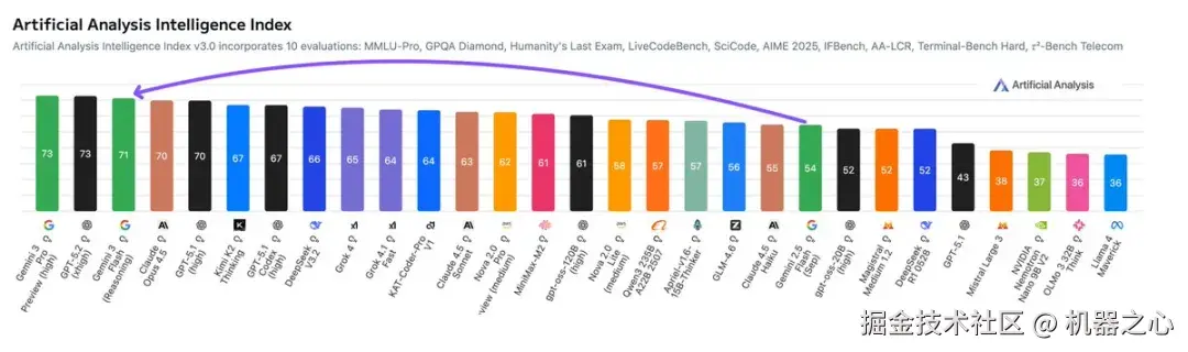 例如,在 Humanity's Last Exam 基准测试中(该测试旨在评估模型在不同专业领域的综合能力),在不使用工具的情况下,Gemini 3 Flash 取得了 33.7% 的成绩。作为对比,Gemini 3 Pro 的得分为 37.5%,Gemini 2.5 Flash 为 11%,而新发布的 GPT-5.2 则为 34.5%。