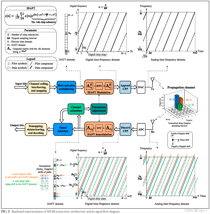 因此,如图3所示,一个N长度的向量可以用来表示DAFT域中的信息符号,其中每个元素对应一个啁啾子载波。AFDM中啁啾子载波的一个吸引人的特点是,即使受到延迟或多普勒偏移的影响,它们仍然保持其啁啾特性(补充:在AFDM中,啁啾特性指的是子载波的频率随时间逐渐变化的特性,即每个啁啾子载波的频率是一个变化的过程,而不是固定的频率)。这可以归因于其时频跨域的特性,使其具有强大的能力,能够同时感知DDC的延迟和多普勒偏移。