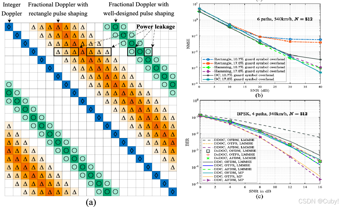 具体而言,DD可分离性和准静态性确保了通过DAFT域导频进行信道估计的可行性,如图3所示。此外,DDC的紧支撑特性表明,DAFT域中的扩散范围较小,使得可以将导频嵌入数据符号中并加以保护,从而提高频谱效率。此外,文献【8]表明,在DDC具有一定DD稀疏度的情况下,精细调节参数 c 1 c_1 c1 可以进一步降低信道估计开销。