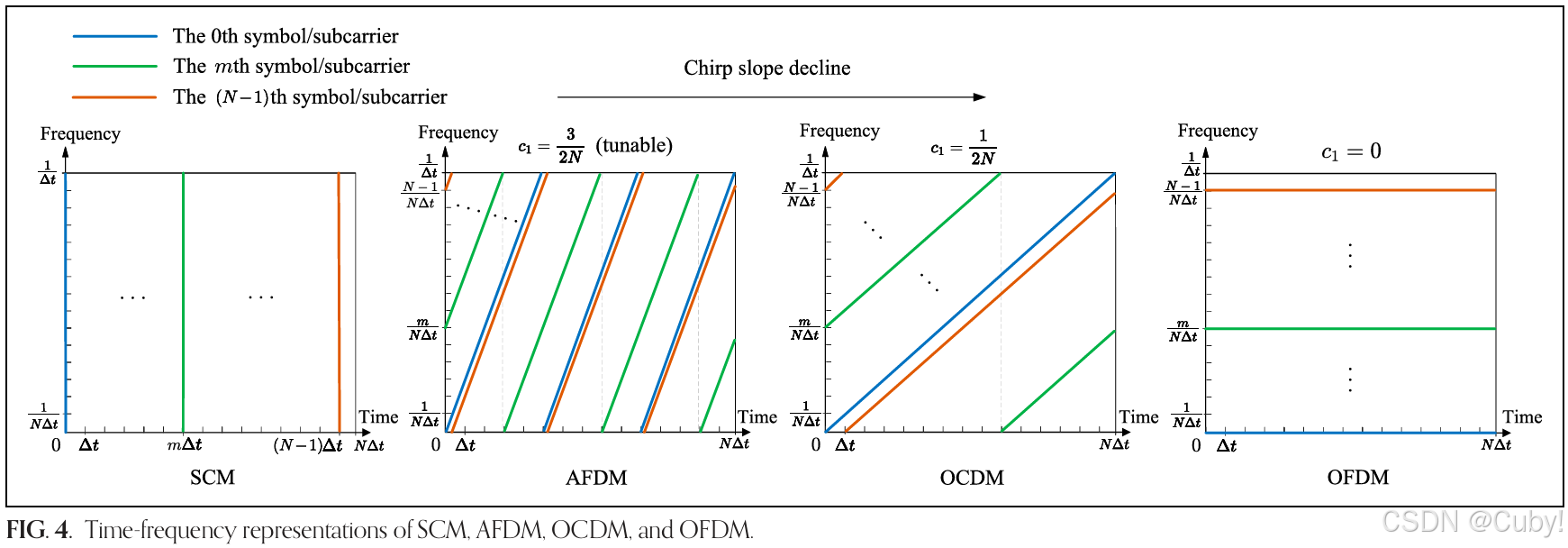 此外,OCDM与OFDM可视为AFDM在特定参数设定下的特例,即当 c 1 = c 2 = 1 2 N c_1 = c_2 = \frac{1}{2N} c1=c2=2N1 时为OCDM,而 c 1 = c 2 = 0 c_1 = c_2 = 0 c1=c2=0 时为OFDM。如图4中SCM、AFDM、OCDM和OFDM的时频表示所示,可以清晰观察到啁啾率逐渐下降的趋势。