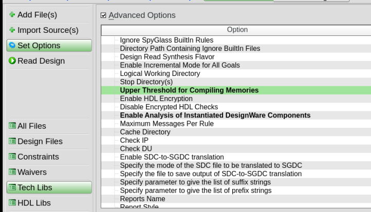 在 Set Option中,指定影响SpyGlass运行的各种设计读取选项。例如,你可以在设计中 指定顶层模块、更改语言、指定宏等等。。