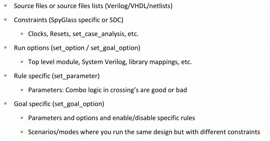 Constraints: SGDC文件 这些文件是包含SpyGlass设计约束的.sgdc文件。这些设计约束用于提供在RTL中无法显而易见的设计信息: clock、reset、
