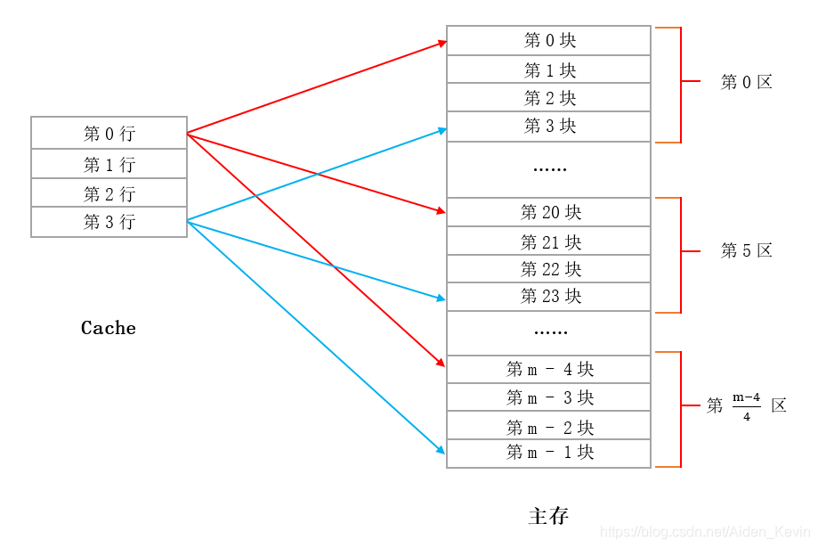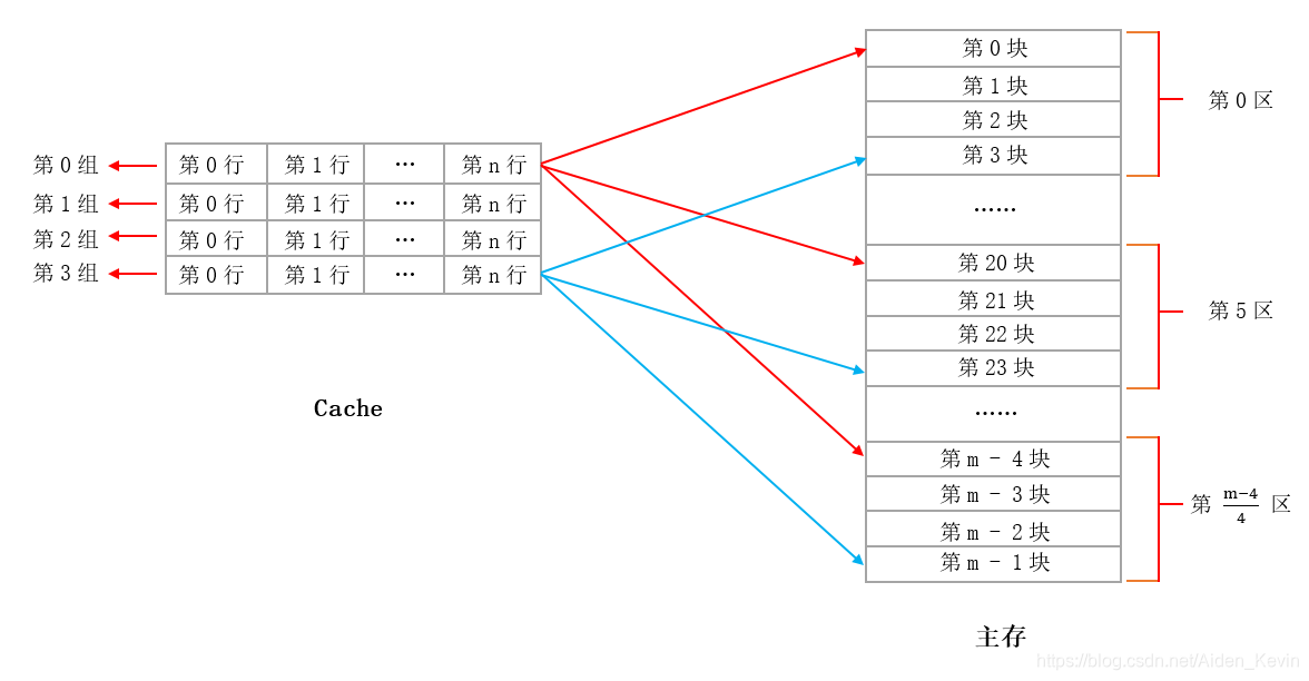 组相联映射基本和直接映射一样,也是将主存划分成了很多个区,唯一的不同就是 Cache 中若干个连续的行组成了一组,如上图所示。其中每个区中的第 i 块对应Cache中的第 i 组( 在直接映射中是每个区中的第 i 块对应Cache中的第 i 行,这点注意 ),在组相联映射中,我们可以将主存中每个区的一块随意存放在 Cache 中某一组的任意一行中。