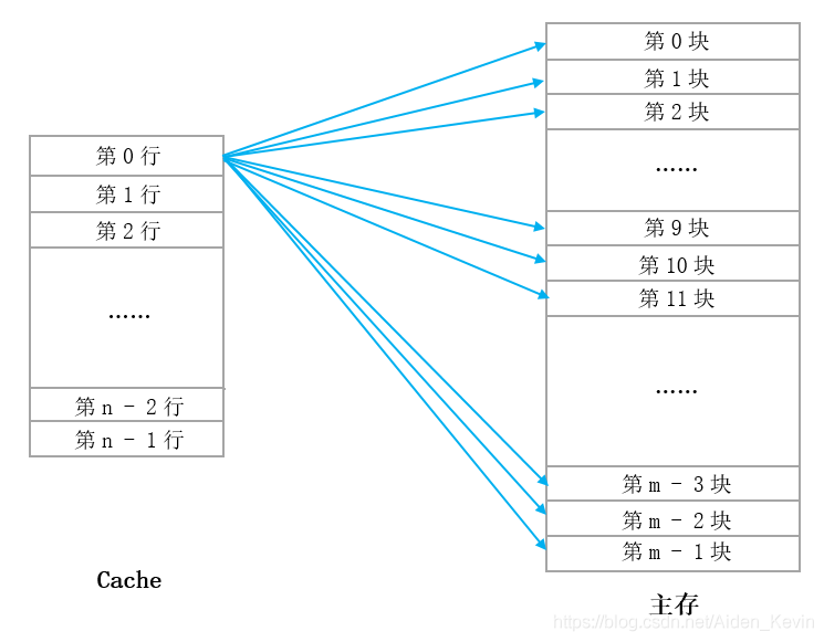 在全相联映射中,我们将主存分成了 m 块,将 Cache 分成了 n 行,Cache中的一行可以存放主存中的任意一块,如图 (1)。而反过来呢,主存中的一块可以存放在 Cache 中的任意一行,如图 (2) 。Cache 和主存之间是多对多的关系,也就是说 Cache 中的任意一行可以存放主存中的任意一块,这就是全相联映射方式。