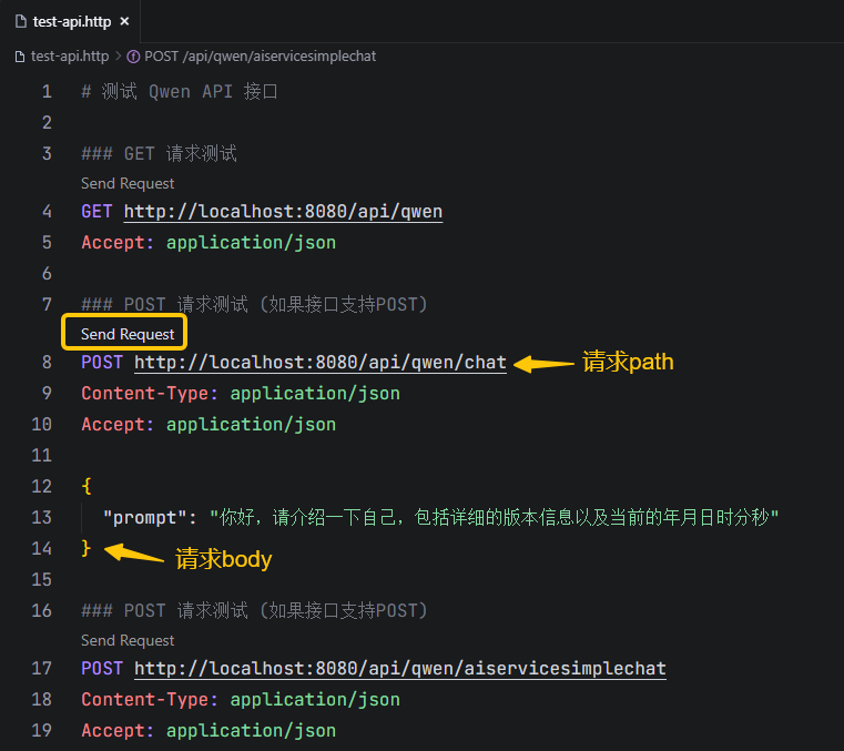 - 如下图所示,只要在vscode打开上述文件,再用鼠标点击下图黄框位置,就能发送请求