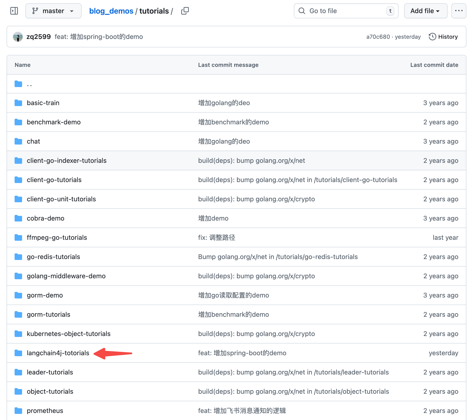 - 这个git项目中有多个文件夹,本篇的源码在langchain4j-tutorials文件夹下,如下图红色箭头所示:
