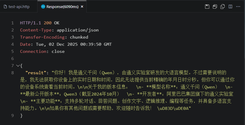 - 响应如下,与前面的/api/qwen/aiservicetemplatechat相比,同样的问题,这次的回答更加简洁,可见系统消息已经生效