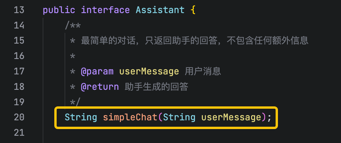 - 先体验最简单的问答,就是Assistant接口的simpleChat方法,如下图黄框