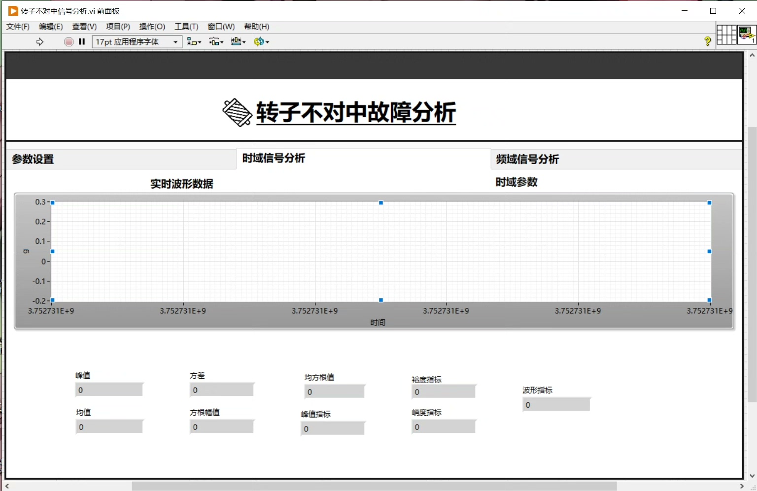 - 有量纲参数分析:直接从振动信号的幅值、均值等有量纲参数入手,就像医生直接看体温数值一样直观。比如通过测量振动位移的幅值,就能初步判断振动的剧烈程度。在LabVIEW中,获取振动位移幅值代码可能如下: