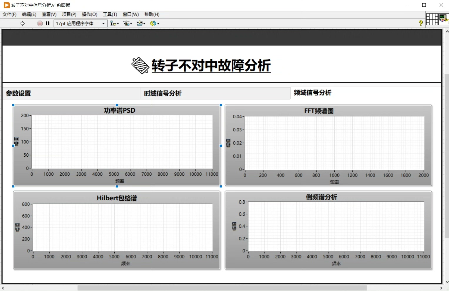 - FFT幅频谱:通过快速傅里叶变换(FFT)将时域信号转换为频域信号,能清晰看到不同频率成分的幅值。在LabVIEW中,利用"FFT"函数就能轻松实现,代码类似如下: