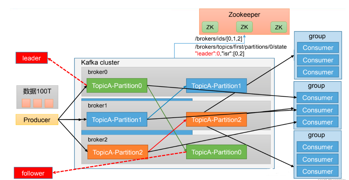 Leader:每个分区多个副本的 "主",生产者发送数据的对象,以及消费者消费数据的对象都是Leader。