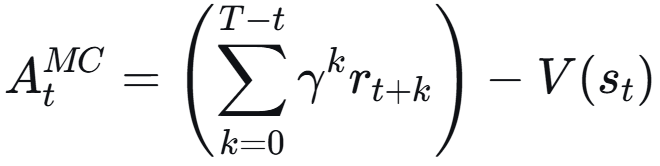 - 蒙特卡洛 :使用整个回合 的真实回报来估计。无偏,但高方差(因为后续所有随机动作和状态转移的噪声都包含在内)。