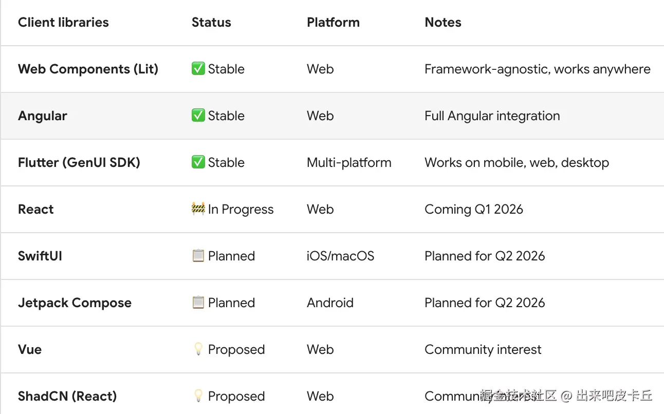 - 生态整合深化:与 A2A(Agent-to-Agent)协议联动,实现 "代理协作生成界面"(如旅行代理调用航班代理的 Skill,同时生成统一预订界面)。