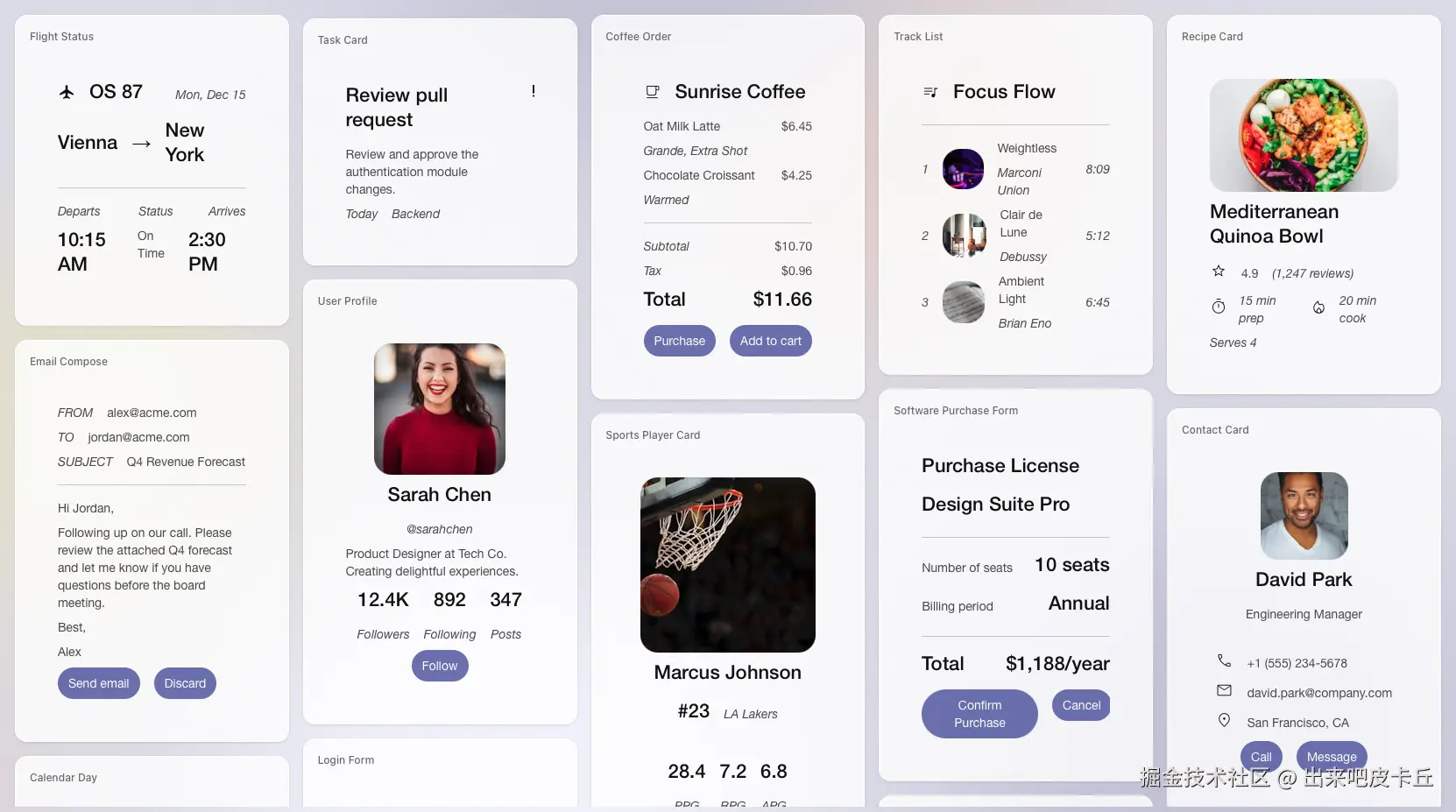 以下是 A2UI 渲染卡片的示例,展示了 A2UI 可以实现的各种 UI 组合。