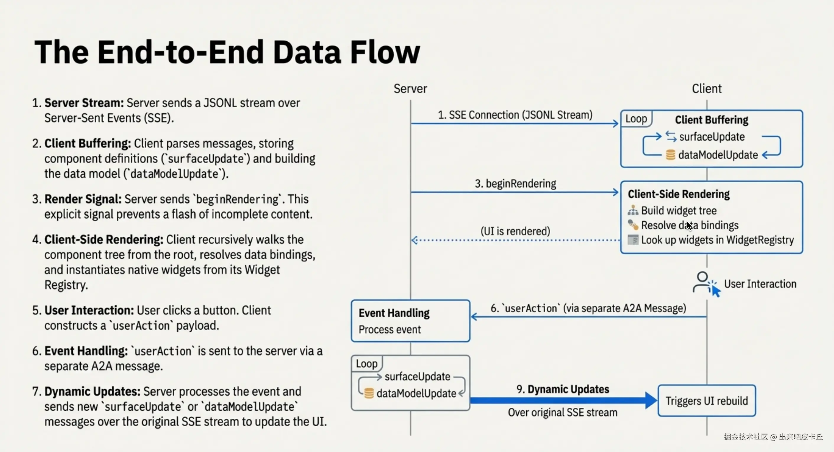 - 渲染体验流畅:JSONL/SSE流式传输支持渐进式渲染,无需等待完整响应,减少加载等待感。