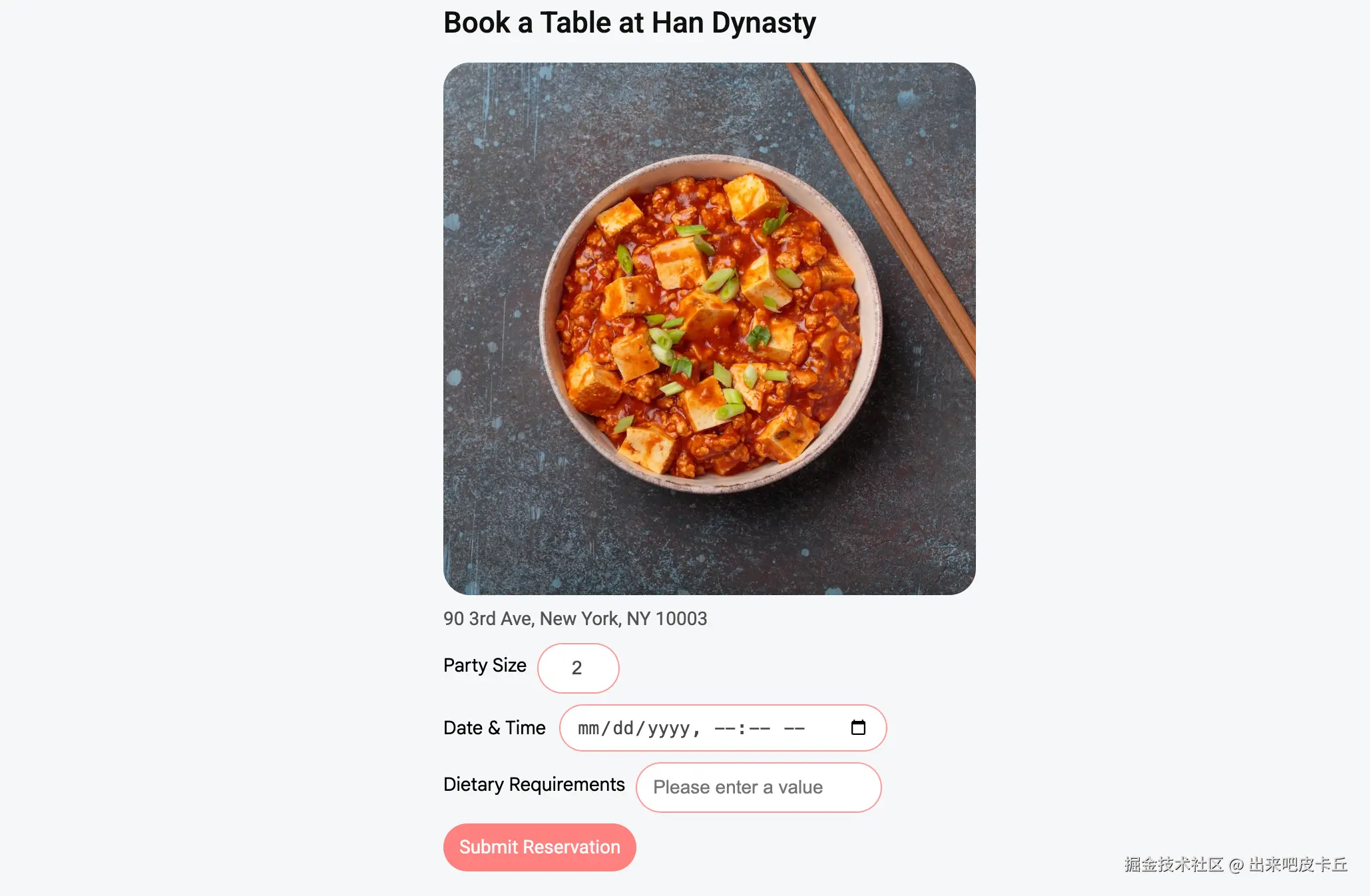 例如,除了上述基于文本的来回聊天之外,您还可以使用 A2UI 来构建此预订界面。下图展示了 A2UI 呈现的餐厅预订界面的一种可能效果,A2UI 的设计赋予前端应用程序对样式的高度控制权,因此还有许多其他可能性。
