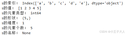 s = pd.Series({'a': 1, 'b': 2, 'c': 3, 'd': 4, 'e': 5})