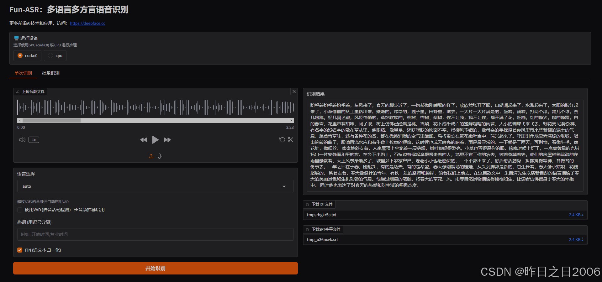上传需要识别的音频文件,识别即可。支持批量,一次上传多个音频文件,批量识别。