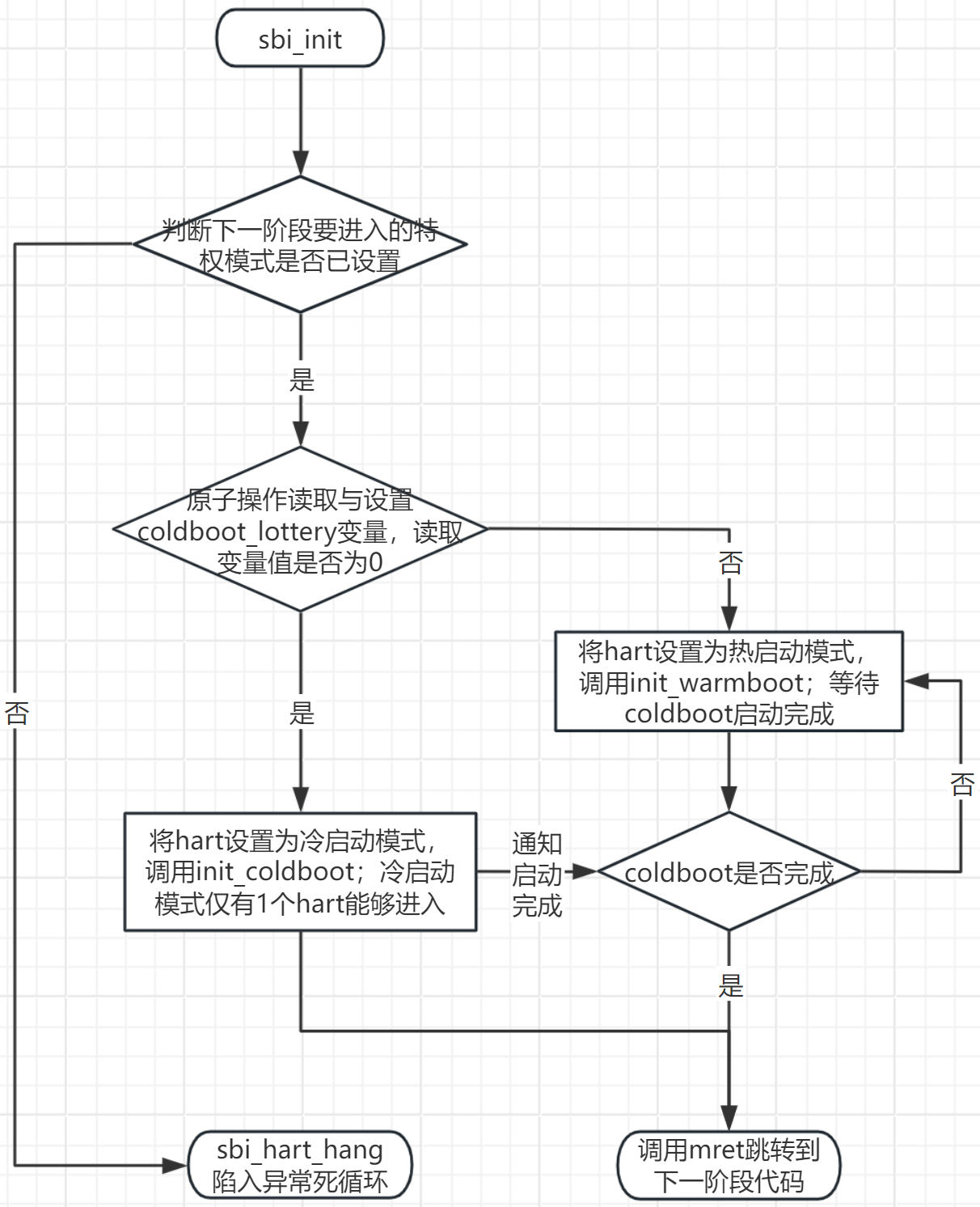 调用sbi_init(struct sbi_scratch *scratch)函数,进入sbi初始化。其中sbi_init的初始化流程如下图所示: