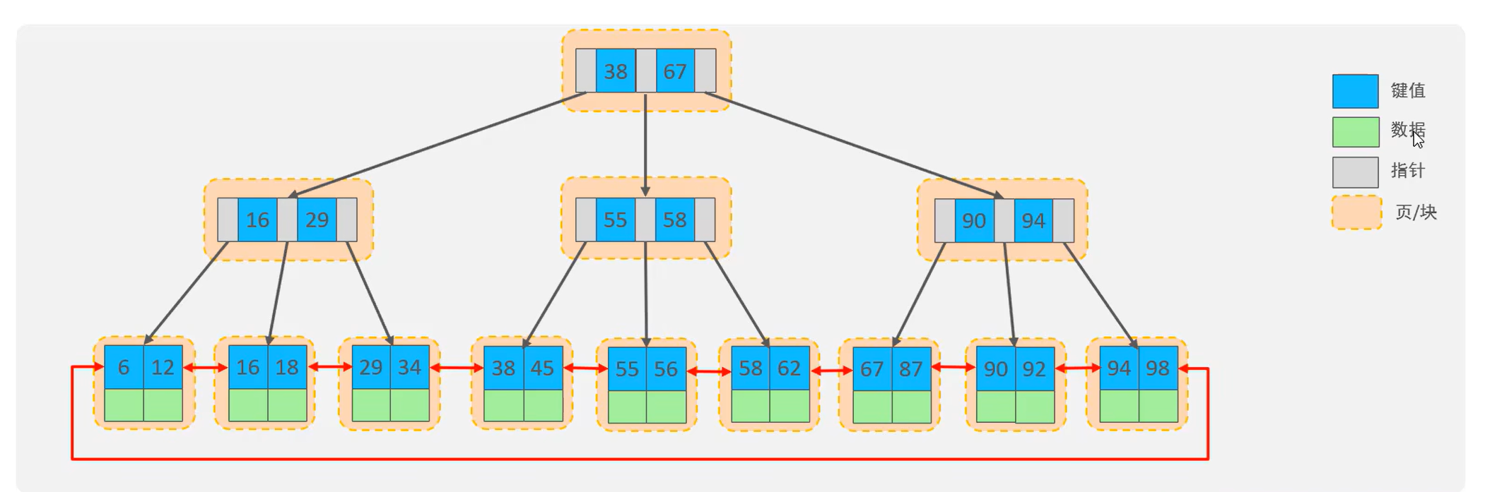 ② MySQL 索引数据结构对经典的 B+Tree 进行了优化。在原 B+Tree 的基础上,增加一个指向相邻叶子节点的链表指针,就形成了带有顺序指针的 B+Tree,提高区间访问的性能。