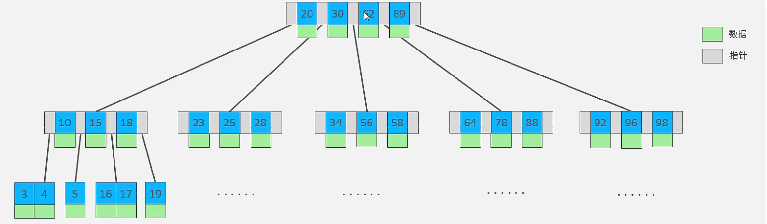 ③ B-Tree 以一棵最大度数(max-degree,指一个节点的子节点个数)为5(5阶)的 b-tree 为例(每个节点最多存储4个key,5个指针)
