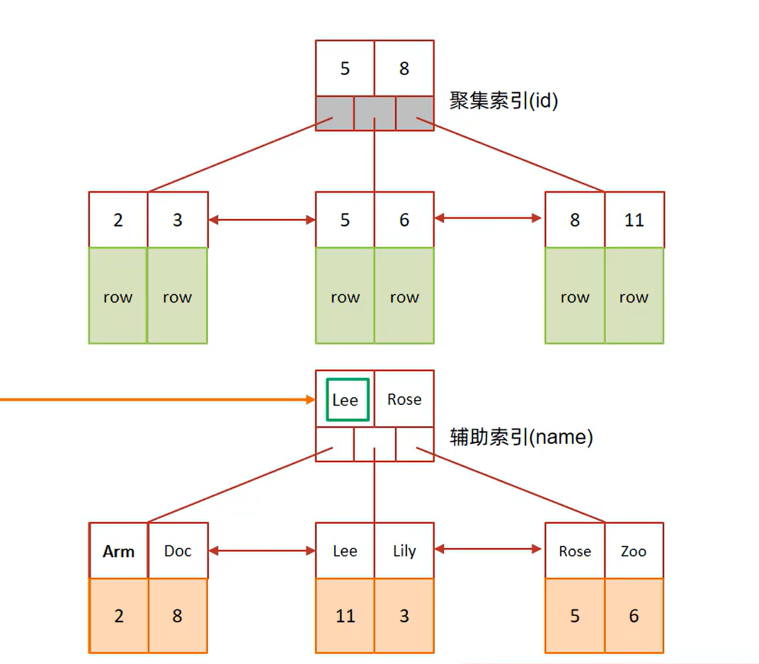 (2) 如果在辅助索引中找聚集索引,只需要通过辅助索引(name)查找到对应的id,返回name和name索引对应的id即可,只需要一次查询。例如: